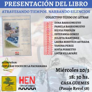El miércoles 20 de marzo a las 18:30 horas, la Casa del Pueblo Güemes (Pasaje Revol 58) será testigo de un encuentro literario y comunitario único, donde convergerán historias y emociones en torno al libro del Colectivo Tejido de Letras: «Atravesando tiempos, narrando silencios», publicado por la Editorial Indígena HEN.