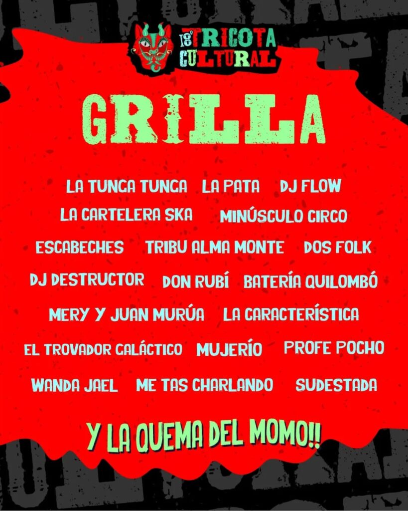 La Tunga Tunga, La Pata, DJ Flow, La Cartelera SKA, Minúsculo Circo, Escabeches, Tribu Alma Monte, Dos Folk, DJ Destructor, Don Rubí, Batería Quilombó, Mery y Juan Murúa, La Característica, El Trovador Galáctico, Mujerío, Profe Pocho, Wanda Jael, Me Tas Charlando, Sudestada y LA QUEMA DEL MOMO!!!